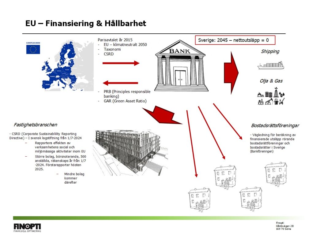 Parisavtalet ligget till grund för EUs taxonomi där EU har har beslutat att bli klimatneutralt år 2050. För att nå dit har man bl.a. infört CSRD (Corporate Sustainability Responsible Directive) där bolag behöver rapportera vilket klimatavtryck som dess verksamhet har. EU har särskilt riktat in sig på banksystemet där banker kommer att behöva redovisa sin egen samt sina kunders klimatpåverkan genom nyttjande av dess produkter och tjänster. Detta kommer att påverka ett flertal sektor som nyttjar banksystemet, exempelvis Shipping, Olja & Gas, samt Fastigheter.